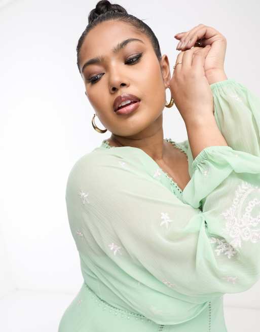 ASOS DESIGN Curve v neck open back embroidered maxi dress with trim detail in green Very well made.
