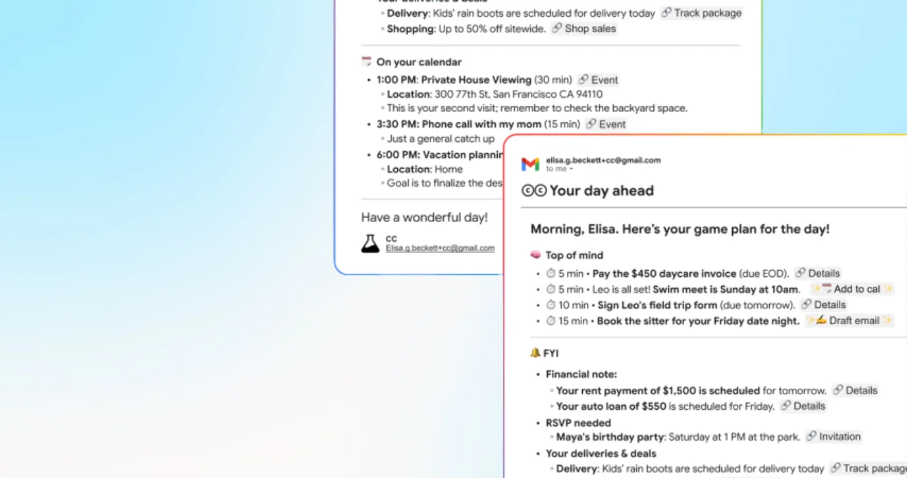 CC uses contextual signals from a user’s Google ecosystem to create a customized briefing every morning. By analyzing your inbox, calendar events, and shared documents, the AI identifies what truly matters for the day. For example, it can flag an unpaid bill buried in your email, remind you of a meeting with prep documents attached, or suggest replying to a time-sensitive message before your first call.